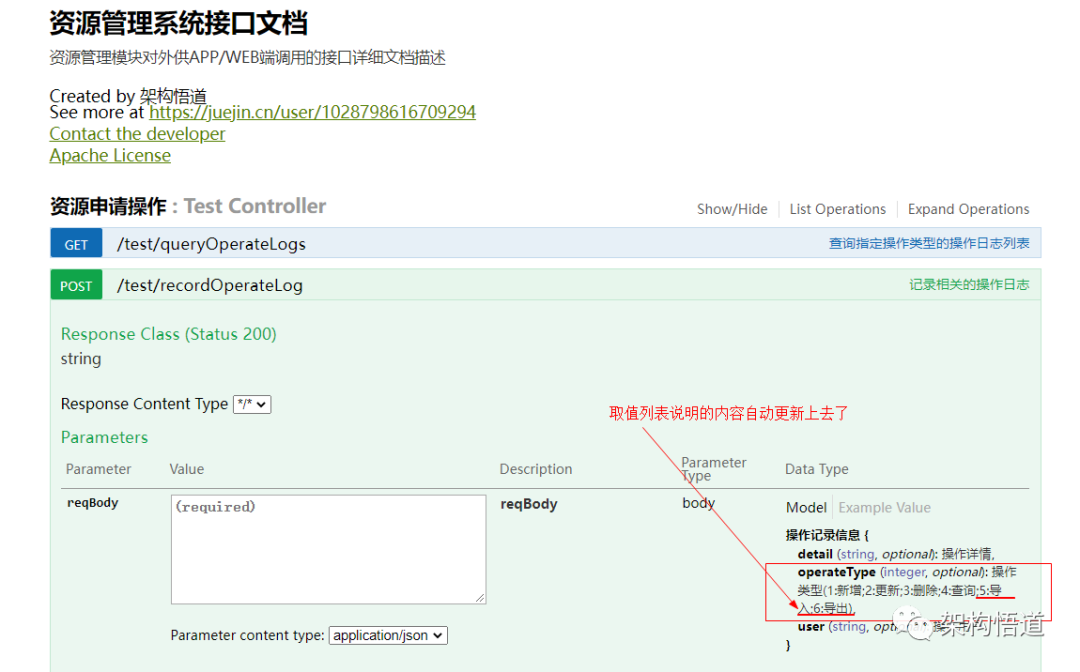 但是上面的两个写法,都存在着同一个问题,就是如果枚举类中的值内容含义有变更,比如OperateType枚举类中新增了一个BATCH_DELETE(5, "批量删除"), 则必须手动去修改所有涉及的接口上的Swagger描述信息。如果有大量场景都涉及此字段,则要改动的地方就非常多,且极易漏掉(因为不好通过代码关联关系直接搜索到)。这样对于开发人员维护起来的成本就会增加,久而久之会导致接口文档的内容与实际代码处理情况不相匹配。