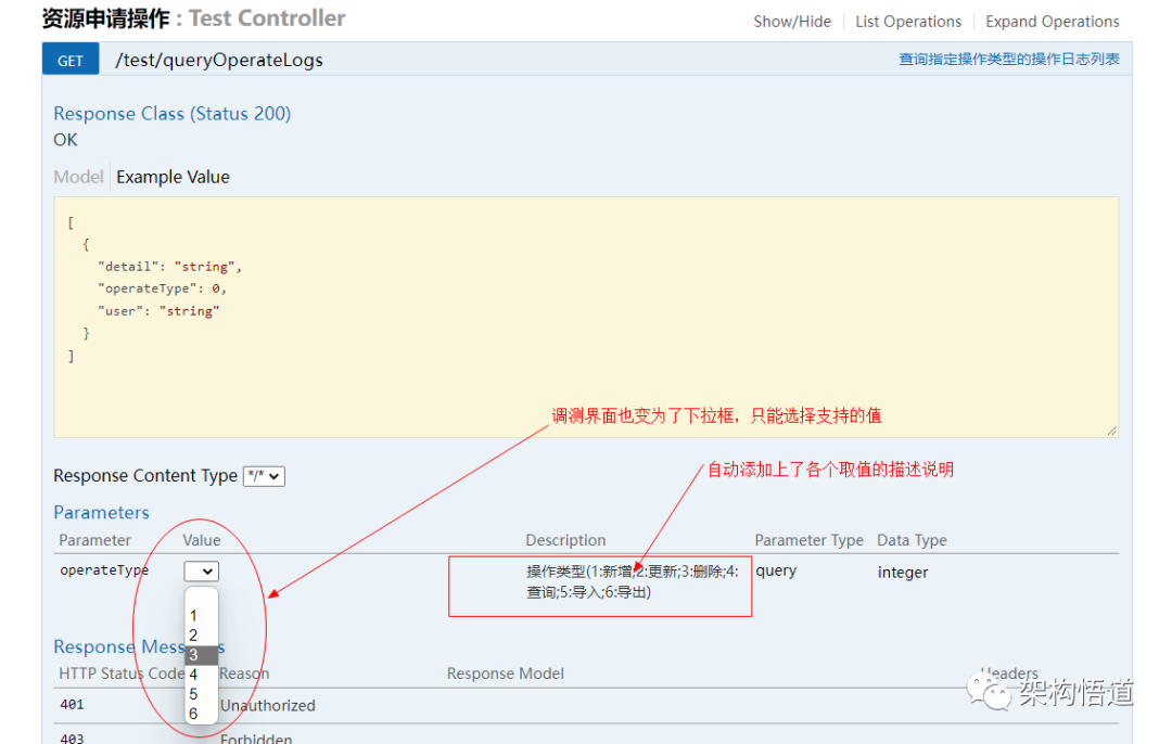 接口URL中携带的请求入参信息,通过@ApiImplicitParam注解来告诉调用方此接口允许接收的合法operateType的取值范围以及各个取值的含义。