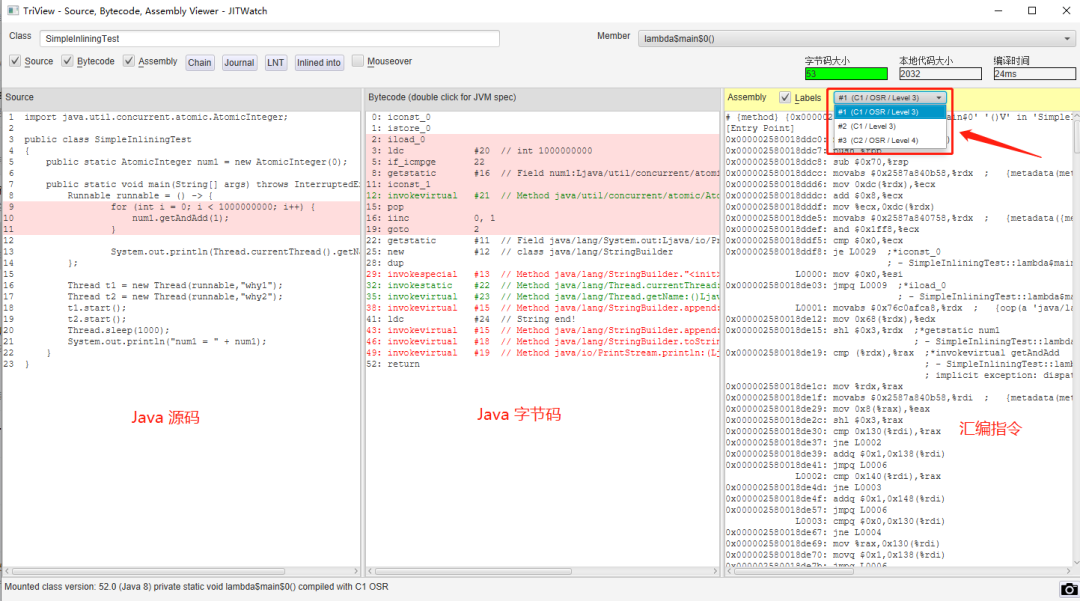 我框起来的部分就是 JIT 分层编译后的不同的汇编指令。
