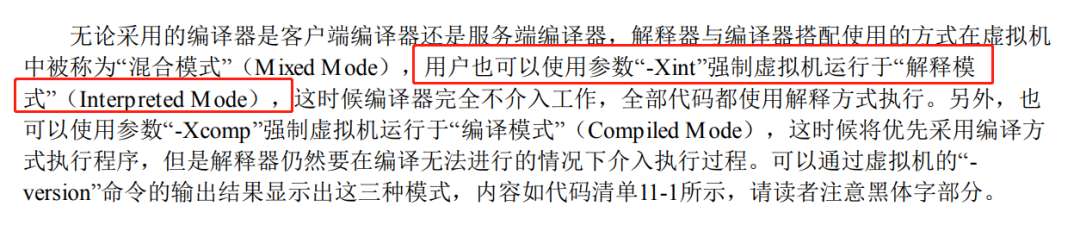 另外,可以使用 -Xint 启动参数,强制虚拟机运行于“解释模式”:
