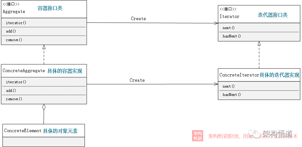 在23种设计模式中,迭代器模式作为其中的行为型设计模式之一,也算是一种比较常见且比较古老的模式了。其对应的实现UML类图如下所示: