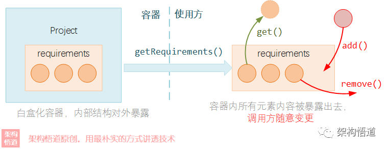 很司空见惯的逻辑,的确也没有什么问题。但是,其实我们仅仅只是需要遍历容器中所有的元素,然后找出符合需要的内容,而Project类通过getRequirements()方法将整个内部存储List对象给出来让调用方直接去操作,存在一定的弊端: