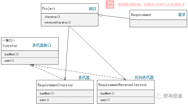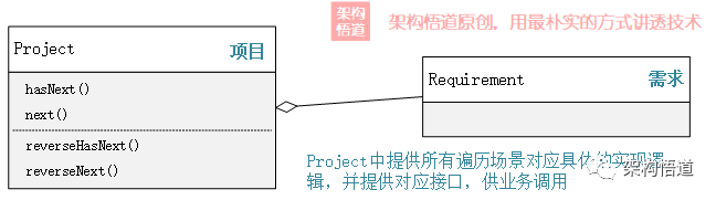 上述的例子中,Project、Requirement便是两个典型的“容器”,容器中会存储着若干具体的元素对象。对容器而言,遍历容器内的元素是无法绕过的一个基本操作。