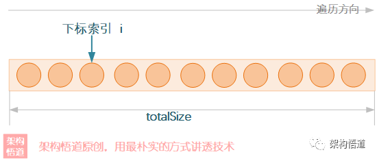 上述处理逻辑中,有两个关键的数据对遍历的动作起着决定作用。一个是下标索引i,用来标记当前遍历到的元素位置;另一个则是集合的总长度,决定着遍历操作是继续还是终止。