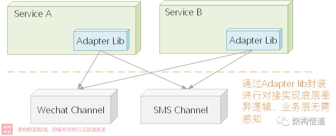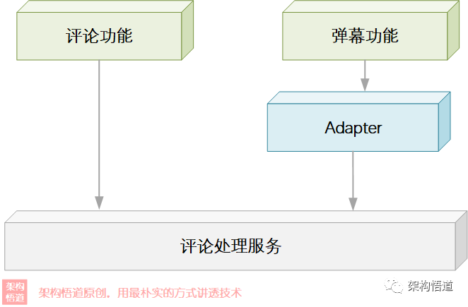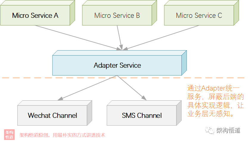 这种是一种相对High Level的Adapter抽象使用(但抽象为服务独立部署后,其实也不仅仅是个Adapter了),广泛的应用于系统架构层面,是解决系统功能复用、业务解耦的一种有效手段。