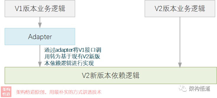 对比我们文首举的那个“插头转换器”的例子,我们可以把图中V1版本业务逻辑当做我们国内的手机充电插头,而图中绿色部分的V2新版本依赖逻辑,则是欧洲地区的圆孔墙面插座,那么如何让国标的扁口插头能用上欧标的圆孔插座呢?关键就是那个插头转换器(Adapter)。