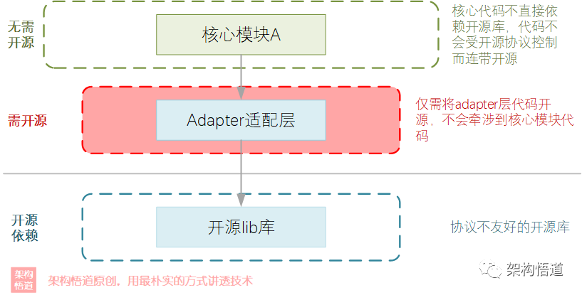 这种情况下,可以基于Adapter的机制,实现弃卒保车的效果。即构建一个适配层,然后仅将适配层进行开源,而核心的模块代码中,则通过接口调用的方式使用适配层即可,这样避免了核心模块代码被开源协议传染。由于核心模块中并没有集成被二次改动后的开源源码,所以也不具有开放源码的义务、而Adapter层没有任何核心业务逻辑,即使开源对公司、对项目也没有影响。