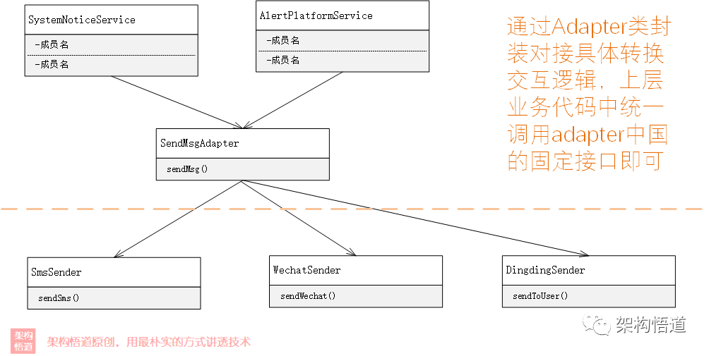 还是以前面举的告警通知消息发送的例子来说明,使用Adapter方式隔离消息通道与业务逻辑的实现UML图如下: