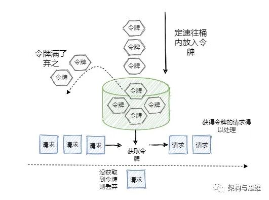 令牌桶和漏桶的原理类似,只不过漏桶是定速流出,令牌桶是定速流入(即往桶里塞入令牌),每个请求进来,分配一个令牌,只有拿到了令牌才能进入服务器处理,拿不到令牌的就被拒绝了。