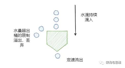 宽进严出是它最大的特点,无论请求多少,请求的速率有多大,都按照固定的速率流出(定速输出),而服务也只能按照固定速率处理,有点像固定延时的消息队列。