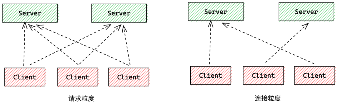 请求粒度负载均衡的实现方式是一个客户端与每个服务端都建立连接,发送请求时按照某种负载均衡策略选择一个服务端进行请求;连接粒度的负载均衡则是客户端在建立连接时按照某种负载均衡策略挑选一个节点进行建连,后续请求都发往这个节点。