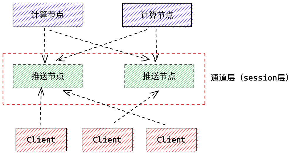 这种情况下就要审视长连接服务设计的是否合理,一般采取分层的思想,长连接这层服务只专注推送,一般称为通道层或者 session 层,它并不复杂复杂的计算逻辑。