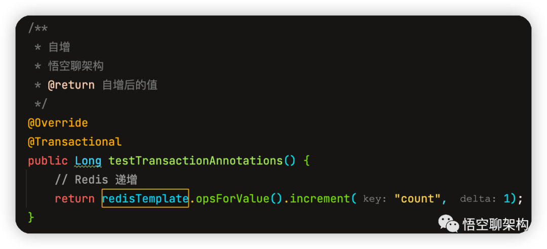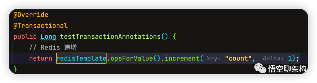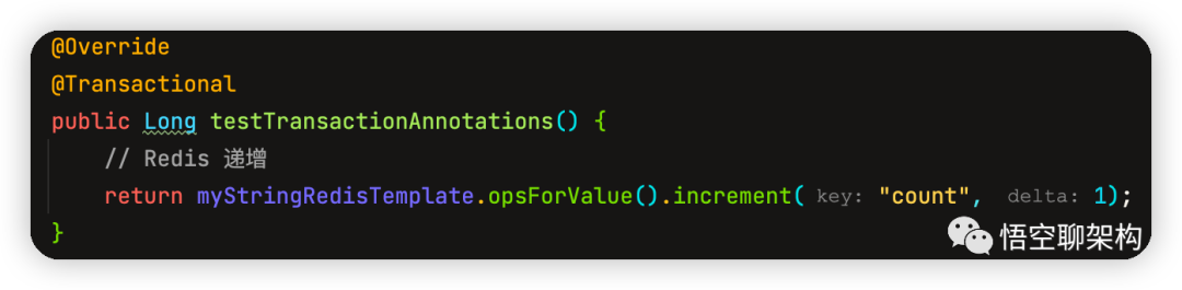 接下来在标注有 @Transactional 注解的方法中执行 Redis 的递增操作。