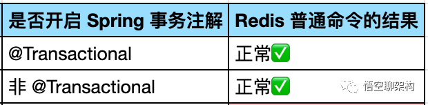 通过这个实验说明在 @Transactional 注解的方法里面执行 Redis 的操作并不会返回 null,结论我记录到了表格中。