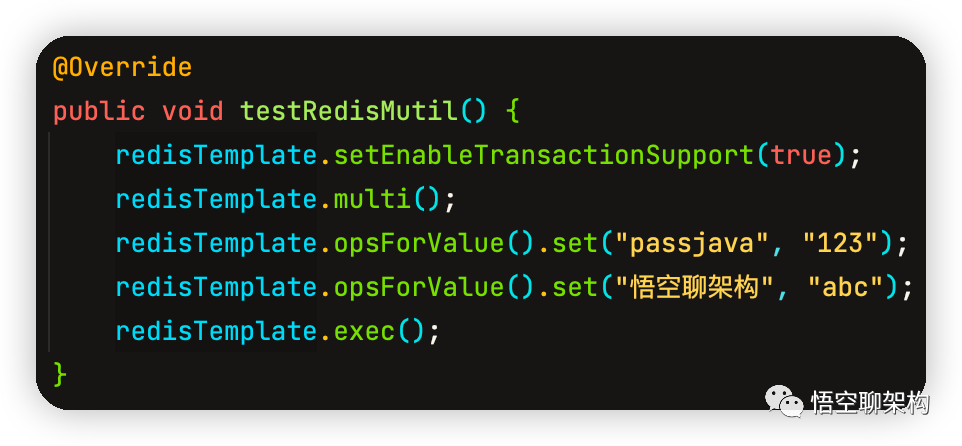 但是这种写法有个弊端,如果在执行 Redis 事务期间,在 @Transactional 注解的方法里面执行 Redis 命令,则还是会造成返回结果为 null。
