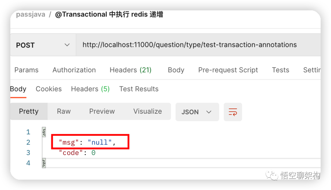 用 Postman 调用这个接口后,正常返回自增后的结果,并不是返回 null。说明在非 @Transactional 中执行 Redis 操作并没有受到 Redis 事务的影响。