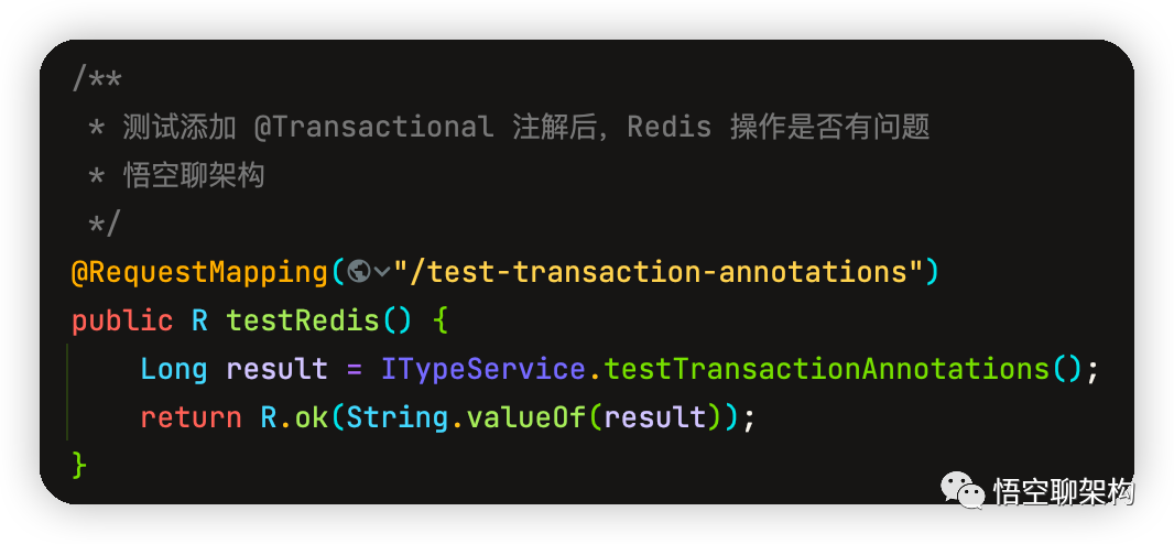 继续看代码,发现在操作 Redis 的 ServiceImpl 实现类的上面添加了一个 @Transactional 注解,推测是不是这个注解影响了 Redis 的操作结果。