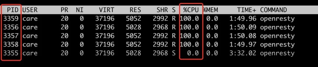 符合预期,只会跑满 4 个普通 worker 进程(pid=3356~3359),此时 3355 的 cpu 使用率为 0。