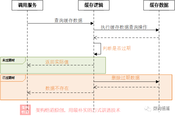 这是另一种数据过期的处理策略,与定时清理这种主动出击的激进型策略相反,惰性删除不会主动去判断缓存是否失效,而是在使用的时候进行判断。每次读取缓存的时候,先判断对应记录是否已经过期,如果过期则直接删除并且告知调用方没有此缓存数据。