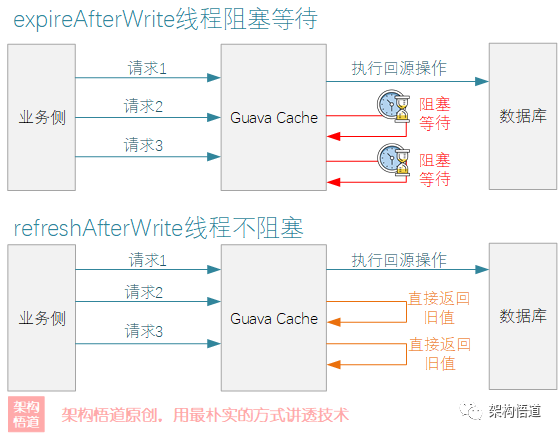 expire操作就是采用的一种严苛的更新锁定机制,当一个线程执行数据重新加载的时候,其余的线程则阻塞等待。refresh操作执行过程中不会阻塞其余线程的get查询操作,会直接返回旧值。这样的设计各有利弊: