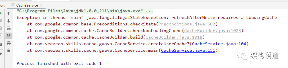 另外,有一点需要注意下,如果创建缓存的时候使用refreshAfterWrite指定了需要定时更新缓存数据内容,则必须在创建的时候指定CacheLoader实例,否则执行的时候会报错。因为在执行refresh操作的时候,必须调用CacheLoader对象的reload方法去执行数据的回源操作。