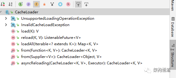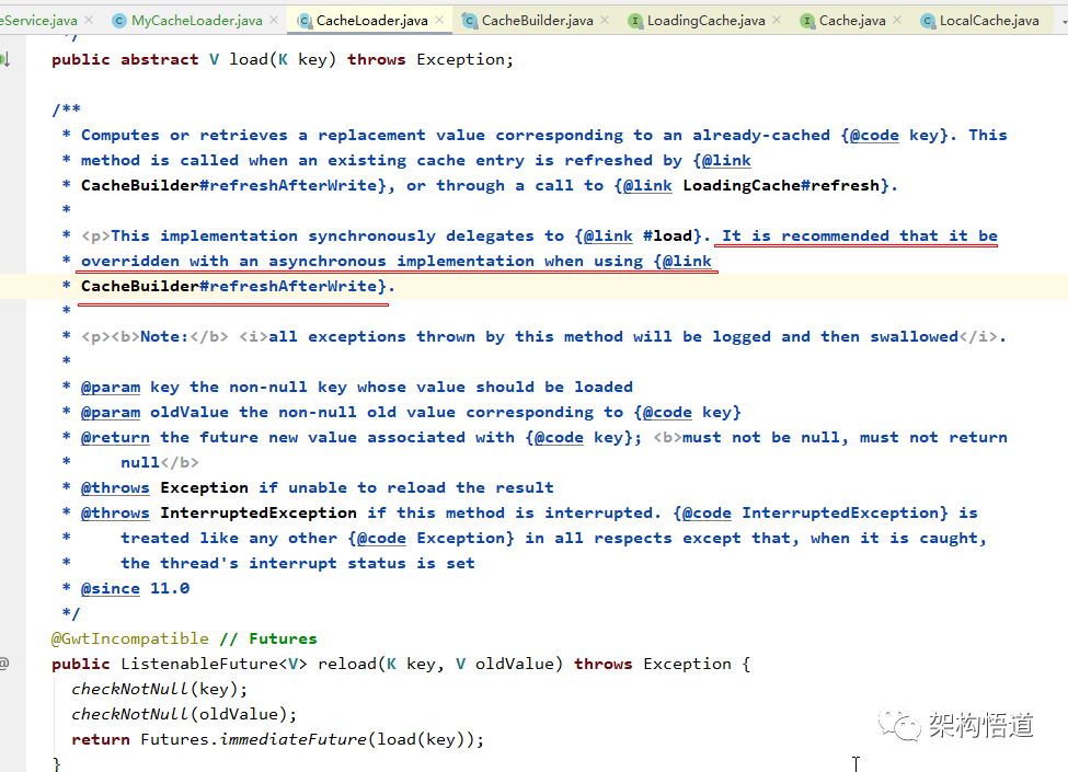 当然,CacheLoader类中还有一些其它的方法,我们也可以选择性的进行覆写来实现自己的自定义诉求。比如我们需要设定refreshAfterWrite来支持定时刷新的时候,就推荐覆写reload方法,提供一个异步数据加载能力,避免数据刷新操作对业务请求造成阻塞。