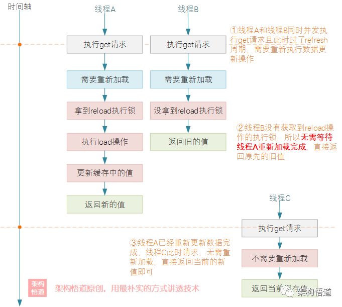 同一时刻仅允许一个线程执行数据重新加载操作,并阻塞等待重新加载完成之后该线程的查询请求才会返回对应的新值作为结果。