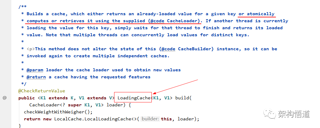 上述代码中,在使用CacheBuilder创建缓存容器的时候,如果在build()方法中传入一个CacheLoader实现类的方式,则最终创建出来的是一个LoadingCache具体类型的Cache容器: