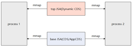 此特性可以使用default JSA(JDK包中自带的基本类的JSA文件)作为base JSA,因此可以简化CDS特性使用步骤,生成top JSA后,运行程序时则同时将base JSA、top JSA映射到内存中以加速启动和节省内存。