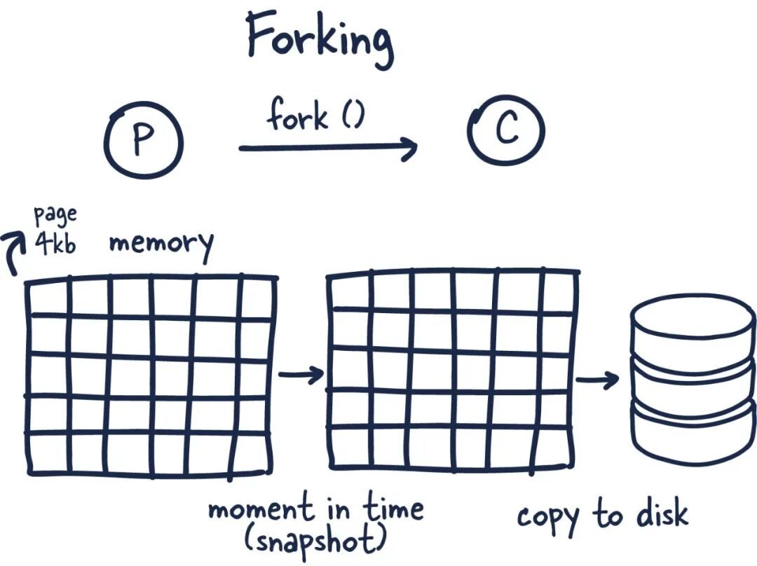 在发生更改的情况下,内核会跟踪对每个页面的引用,如果某个页面有多个更改,则将更改写入新页面。子进程完全不知道更改以及具有一致的内存快照的事情。因此,在只使用了一小部分内存的情况下,我们能够非常快速有效地获得潜在千兆字节内存的时间点快照!