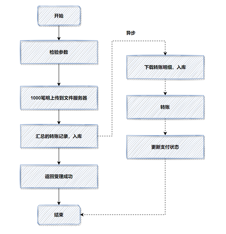 记得当时压测的时候,高并发情况,这1000笔明细入库,耗时都比较大。所以我转换了一下思路,把批量的明细转账记录保存的文件服务器,然后记录一笔转账总记录到数据库即可。接着异步再把明细下载下来,进行转账和明细入库。最后优化后,性能提升了十几倍