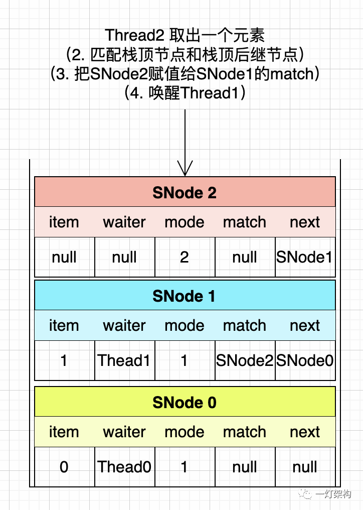 transfer方法逻辑也很简单,就是判断本次操作类型是否跟栈顶节点相同,如果相同,就把本次操作压入栈顶。否则就跟栈顶节点匹配,唤醒栈顶节点线程,弹出栈顶节点。
