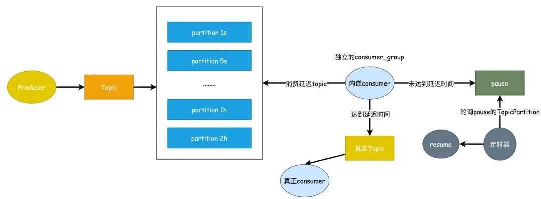 consumer单独设置一个ConsumerGroup去消费延迟 topic 消息,消费到消息之后如果没有达到延迟时间那么就进行pause,然后seek到当前ConsumerRecord的offset位置,同时使用定时器去轮询延迟的TopicPartition,达到延迟时间之后进行resume -