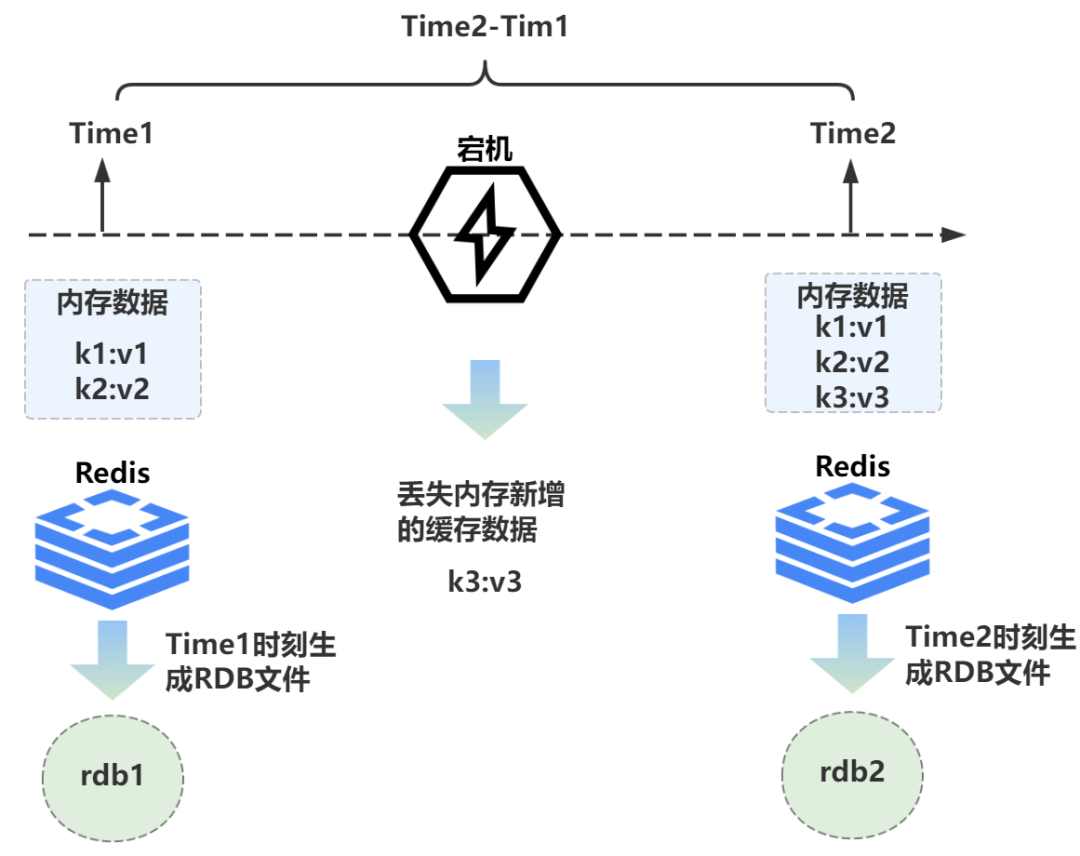 由于Redis保存RDB快照文件的策略是按照配置的时间间隔进行持久化保存,也就是每隔一个时间间隔Redis就会保存一个RDB文件。因此在内存数据有更新但是RDB保存时间尚未到来的这段时间如果存在服务器宕机或者服务器重启的情况,此时内存的数据就会存在丢失的风险,因为Redis还没来得及将数据持久化到RDB文件中。