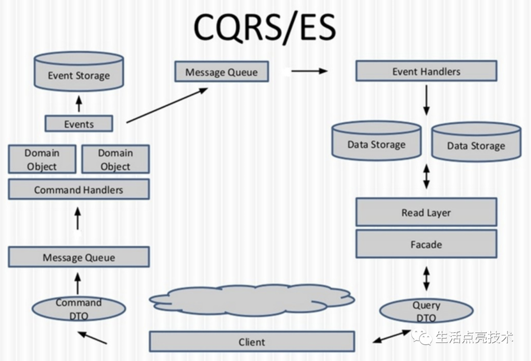 C(Command)端负责数据存储,Q(Query)端负责数据查询,Q端的数据通过C端产生的Event来同步。