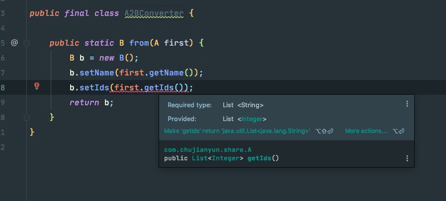 可以成功的将 A 中List<Integer>转为 B 中的List<String>类型。(搜索公众号Java知音,回复“2021”,送你一份Java面试题宝典)