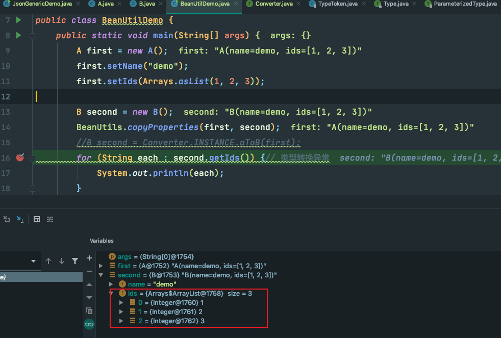 打断点可以看到,属性拷贝之后 B 类型的 second 对象中 ids 仍然为 Integer 类型:
