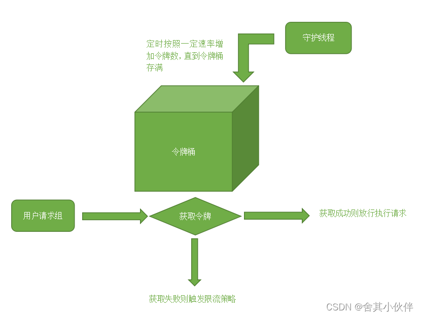 令牌桶算法 令牌桶算法 是程序以v(v = 时间周期 / 限流值)的速度向令牌桶中增加令牌,直到令牌桶满,请求到达时向令牌桶请求令牌,如果获取成功则通过请求,如果获取失败触发限流策略。