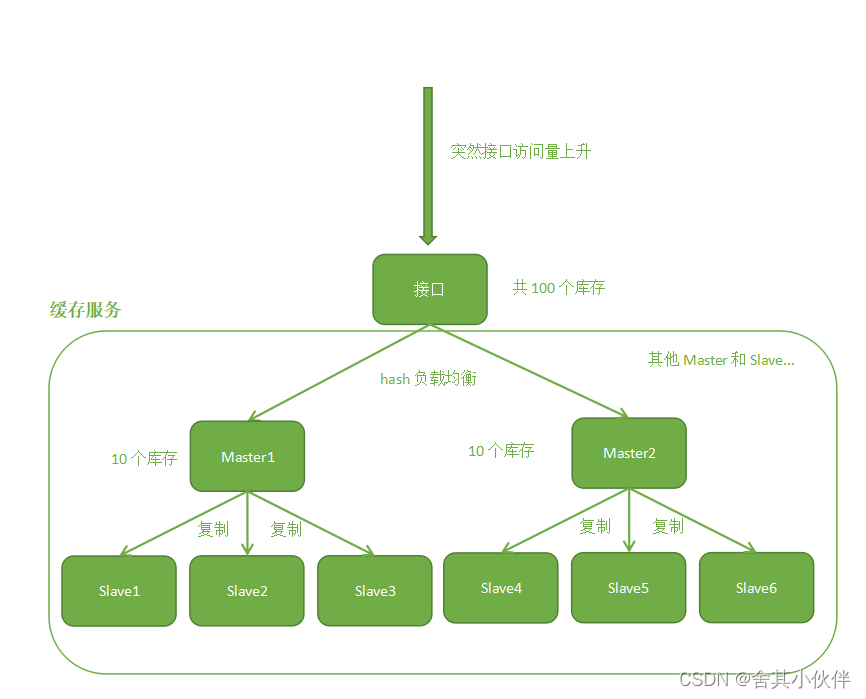 我们可以参照 ConcurrentHashMap 中的 counterCells 变量的设计思想,将100个库存拆分到10个缓存服务中,每个缓存服务有10个缓存,然后我们再对请求进行负载均衡到各个缓存服务上。