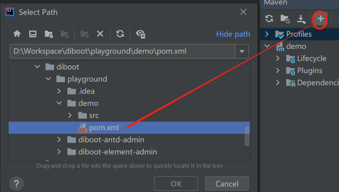 待克隆完成后,在右侧 Maven 视图中,添加 demo 项目下的 pom.xml,以让 IDEA 识别为 maven 项目。