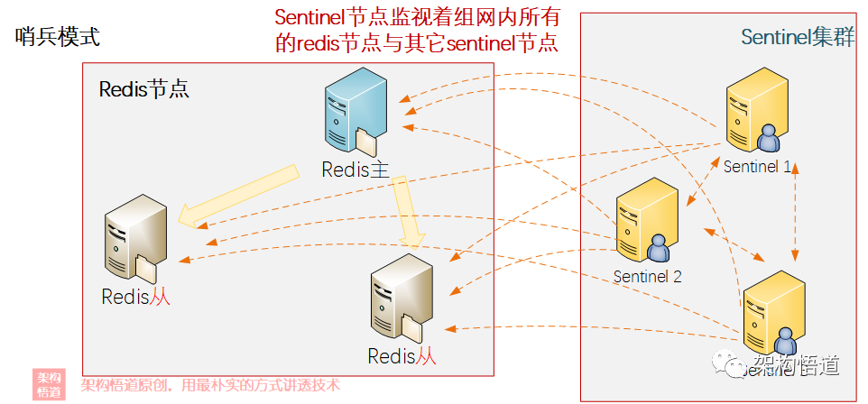 实际使用的时候,手动故障恢复的时效无法得到保证,为了支持自动的故障转移与恢复能力,Redis在主从模式的基础上进行优化增强,提供了哨兵(Sentinel)架构模式。