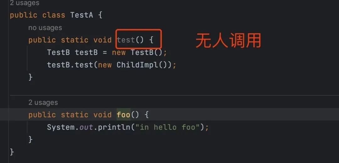 从 idea 的代码提示也可以确认 TestA 的 test 方法是没有人调用的。