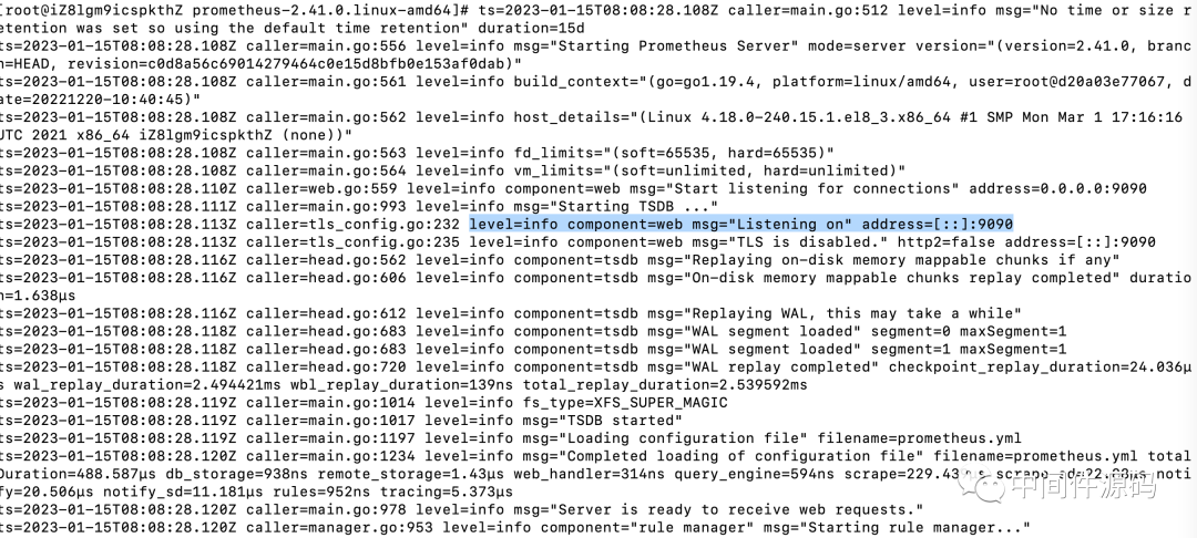 启动服务成功后可以看到如下info日志,普罗米修斯启动后监听了一个9090端口。