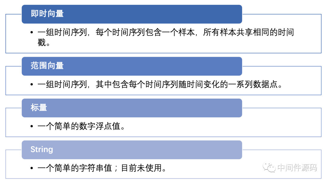 在 Prometheus 的表达式语言中,表达式或子表达式可以计算为四种类型之一: