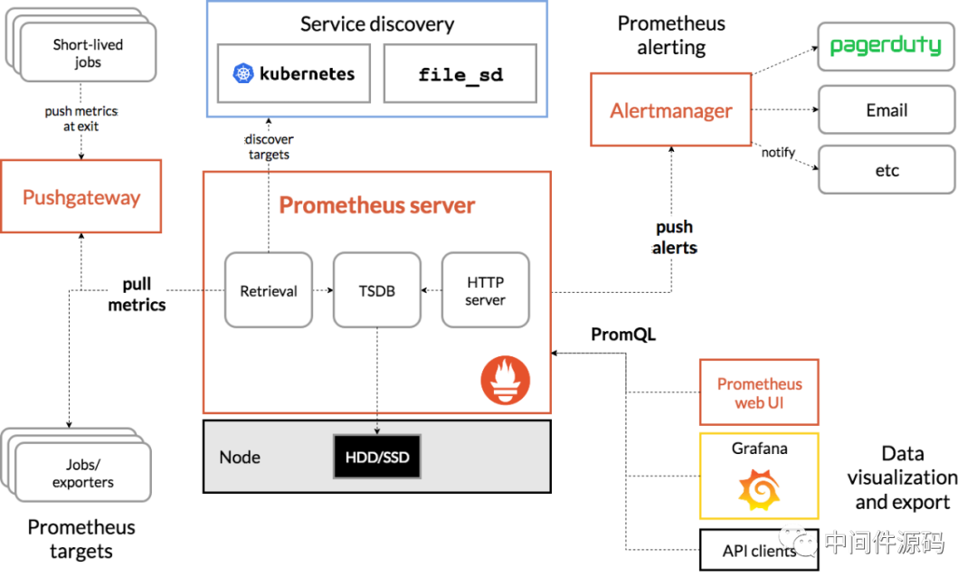 这个图完整的体现了普罗米修斯从发现服务,采集数据,到监控告警分析数据的整个过程: