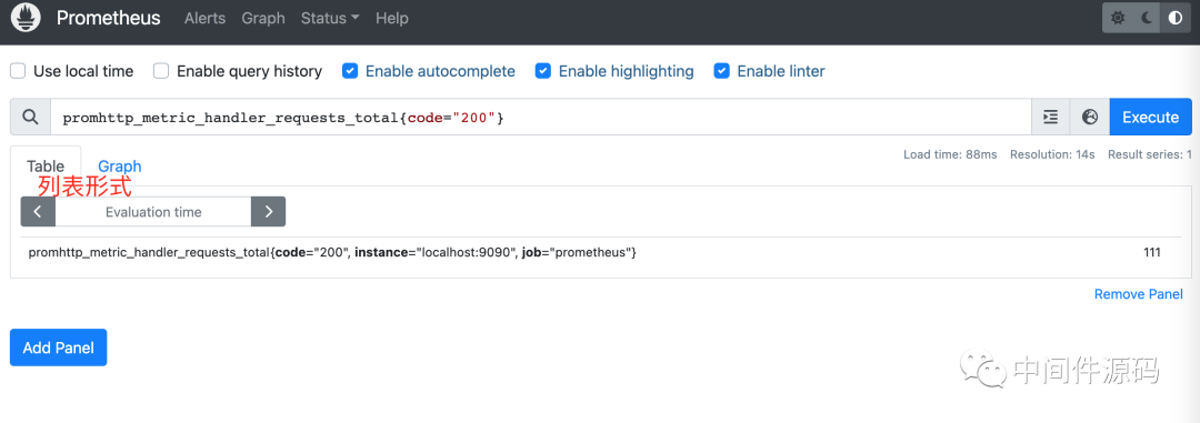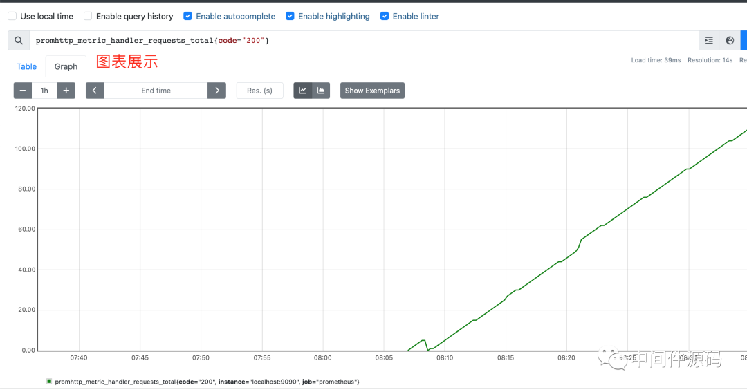 了解了基本语法之后可以重新打开dashboard输入以下命令来111查询筛选标签中状态码为200的请求数据:promhttp_metric_handler_requests_total{code="200"} 查询结果如下图所示: