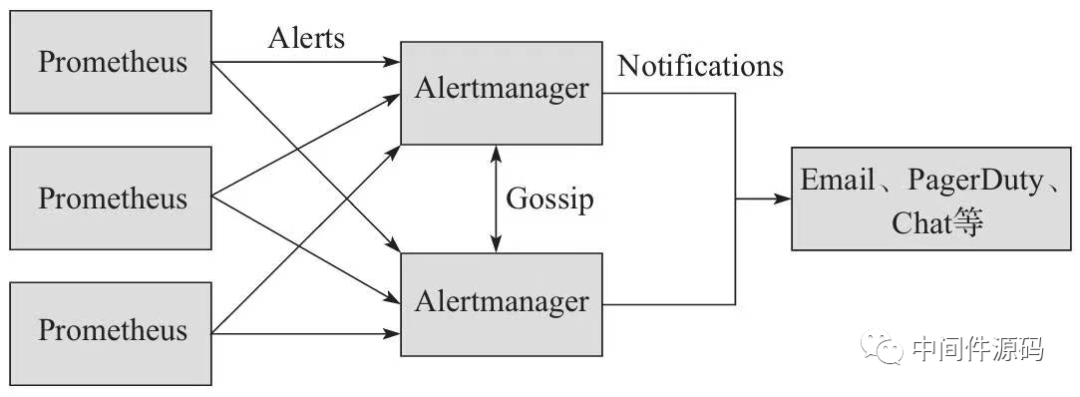 Alertmanager是独立于Prometheus的一个告警组件,需要单独安装部署,Prometheus可以将多个Alertmanager配置为一个集群,通过服务发现动态发现告警集群中节点的上下,如下图: