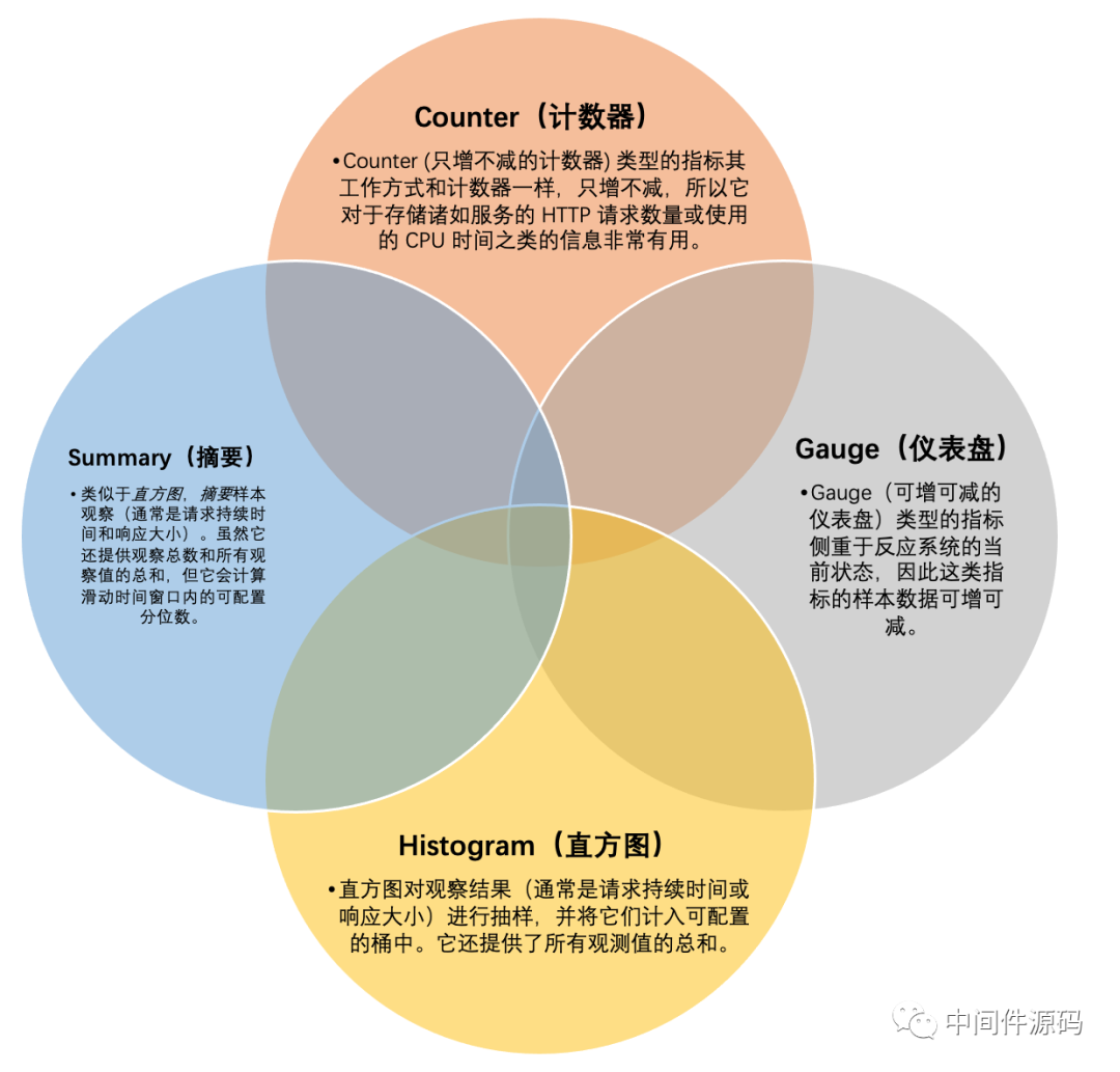 Prometheus 客户端库提供四种核心指标类型,用来解决不同指标差异区分,帮助用户理解和区分这些不同监控指标之间的差异,Prometheus 定义了 4 种不同的指标类型:Counter(计数器)、Gauge(仪表盘)、Histogram(直方图)、Summary(摘要)。