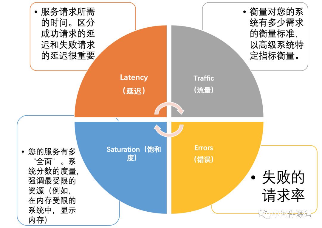 Google SRE中提到的概念,监控的四个黄金信号是延迟、流量、错误和饱和度。如果您只能衡量面向用户的系统的四个指标,请关注这四个指标。原文链接如下: