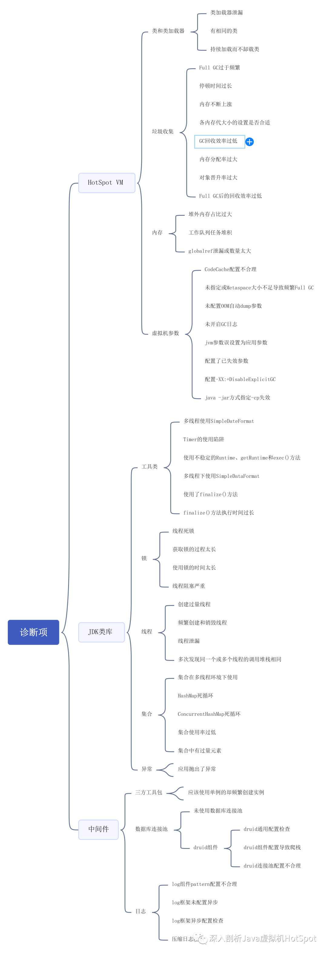 要做到一键诊断,需要经过大量的实践积累,将千奇百怪的问题进行归纳整理,放到相关的类别中,我们可以将Java应用常见的问题归纳为如下几类:
